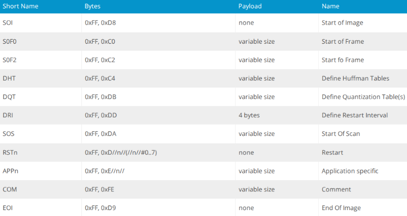 To truly understand how polyglots work, I will discuss a common polyglot used by malicious actors; JPEG+ZIP is an image file (JPEG) which contains a .ZIP file inside of it. The opposite can be true where it’s a zip file with a hidden JPG image. JPEG’s are the easiest polyglots to work with, due to how JPEG file only requires two main components for our polyglot to function: a start of image (SOI) and end of image (EOI). A detailed diagram of what a JPEG structure looks like is shown below.