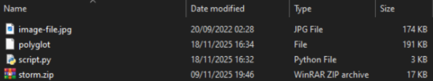 if name == "main": jpg_file = "image-file.jpg" zip_file = "storm.zip" output_file = "polyglot"