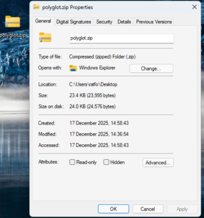 In this screen shot, the file ‘polyglot’ is our mischievous file, it is both a zip and jpg file. The other files in the directory are the files used by the python script. When used in a Windows, we can identify the two different extensions in one file.