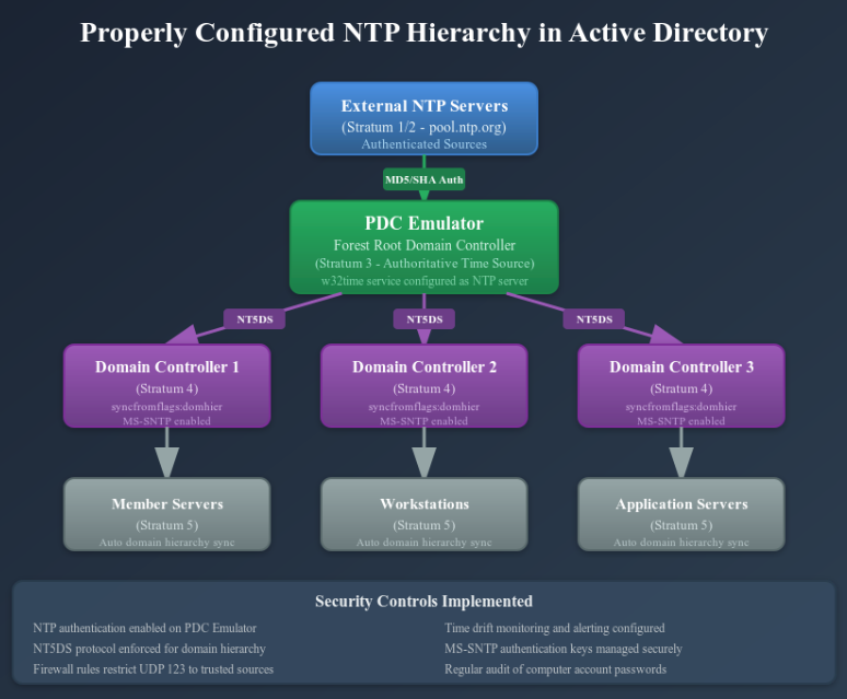 That being said, some environments require symmetric keys for compatibility reasons, and so it is important to scope as well as rotate them consistently – other symmetric authentication (like NTP MACs) work but tend to be fragile due to narrow key scopes, and fewer clients per key but secure distribution through out-of-band or protected channels paired with regular rotation will significantly reduce the risk of key compromising and other similar attack vectors such as forged authentication replies. As a rule of thumb, it has considered poor systematic design to allow unauthenticated public NTP services on PDC(s)/DC(s) or a single-server setup – any unauthenticated configurations for domain time sources are objectively a poor security decision.