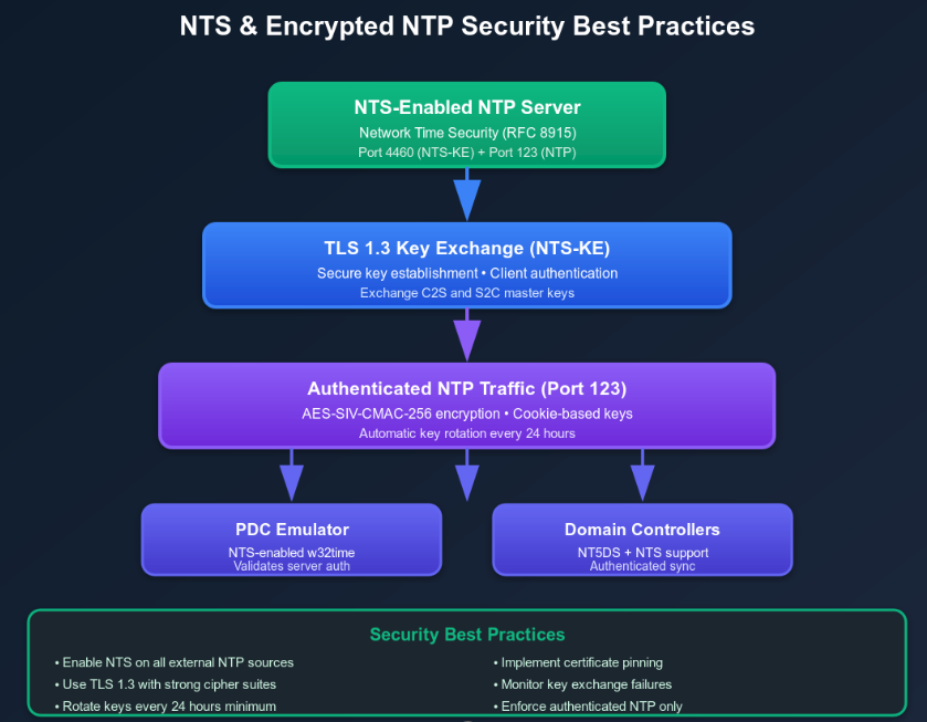 Current Microsoft documentation describes that correct implementation of NTP authentication should include mutually authenticated sessions where NTS is possible – integrating per-peer keys without reusing a single key across too many peers, storing these keys securely with appropriate file permissions, OS key stores, or a secrets manager, and finally restricting NTP access, limiting which IPs can query the server through host-based ACLs or firewall rules.